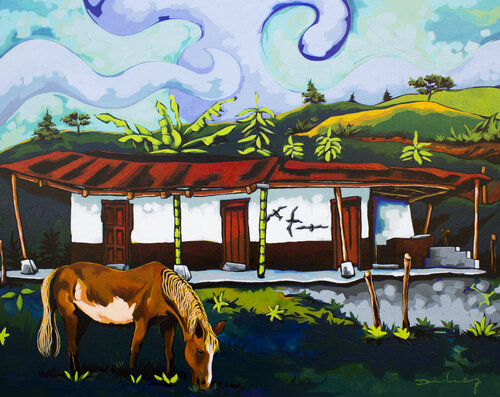 Didier Franco is a Colombian painter who from a young age has considered art as a way of life. Working primarily in acrylics, Franco’s subject matter is broad and ever-changing; he depicts the urban and the rural, the intimate and the collective, the natural and the created. The artist’s distinctive style particularly revolves around his use of color. In pairing complementary and contrasting primary colors with minimal gradation, Franco’s works provoke pleasant and aggressive sensations within the viewer simultaneously.