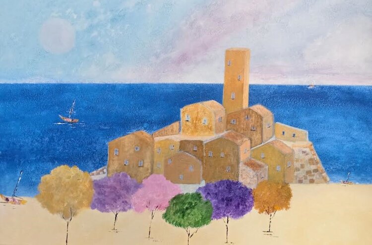 In my work, I tried to capture the quiet essence of a coastal village, surrounded by the calm of the sea and overshadowed by ancient history. Using acrylics, I played with warm tones for the houses to convey a sense of welcome and community, while the sky and sea stretch out in soothing shades of blue. The colorful trees in the foreground represent life and energy, adding a touch of whimsy and joy. This work invites you to reflect on the beauty and… serenity of simple life, bringing an atmosphere of peace and warmth to any environment it is placed in.