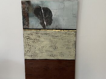 In this work, I have created a connection between past and present using acrylics, collage, and gold leaf. The abstract and impressionistic elements reflect inner thoughts and memories, while the golden line symbolizes hope and value. It brings a calm yet powerful energy to any room, inviting reflection and feeling.