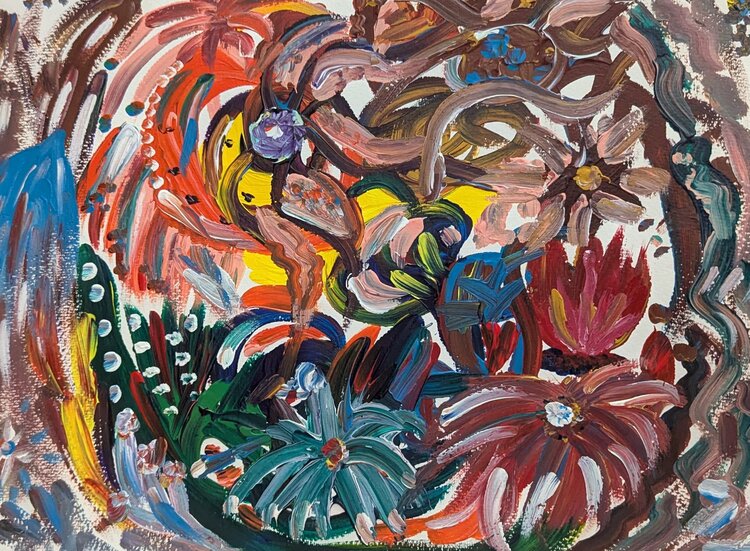 Organic, floral forms appear not as decoration, but as symbols of growth, transformation, and vibrant energy. The color fields act like a pulse – powerful yet focused.