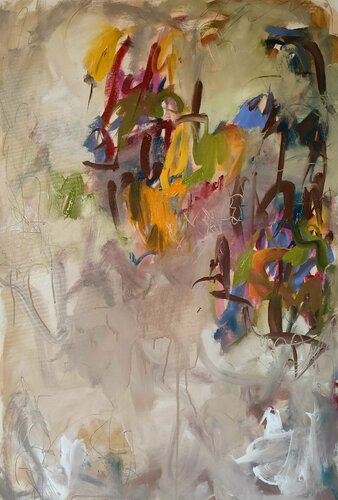 On a neutral but nuanced background, the colors seem to dance, overlapping, superimposed in a flexible but dynamic gesture.