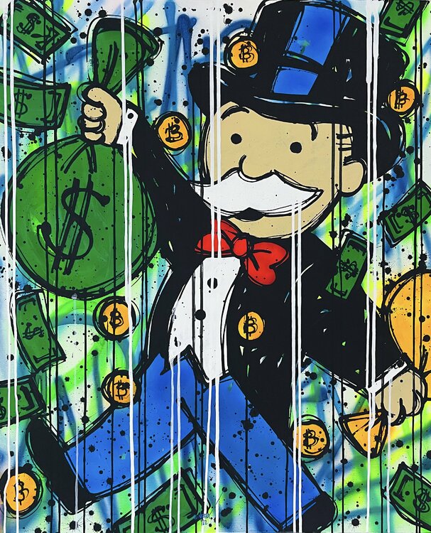 In this vivid piece, I've expressed the electric allure of prosperity, blending pop art zest with a lively figurative twist. Using acrylic and spray, I've captured the dynamic spirit of abundance, creating a visual symphony that sings with the vibrancy of financial liberation. It's an artwork that radiates the thrill of success and the joy of achievement, destined to invigorate any space with its pulsating energy.