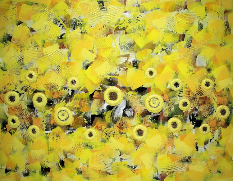 "Energy 19506" is an abstract painting that captures the essence of nature's vitality. Created with acrylic on canvas, this modern artwork explores the energy cycle and the spreading of life force through vibrant color and dynamic form. Intense yellows and oranges dominate the canvas, conveying a sense of life, positive vibration, and the organic relationship between humanity and nature.
