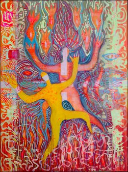 Her multifaceted and vibrant works are created using acrylic, tempera, collage and ink on canvas, paper or found materials.