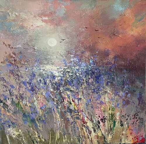 In this painting, I aimed to capture the serene ambiance of a tranquil twilight. Using oil paints, I employed broad, expressive brush strokes to evoke a field awash with the dying light of day, where purples and blues dominate, yet are ignited by flecks of crimson and gold. This scene, centered around a delicate, luminous moon, evokes a sense of peace and contemplation. In any space, it invites the viewer to pause and find solace in the beauty of… a fleeting moment, encapsulating the eternal dance of light and color.