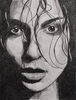 In this drawing, I wanted to capture the intensity and depth of a gaze filled with complex emotions. With realism, the work reflects every detail and texture, like the damp hair falling across the face, conveying both vulnerability and strength. This piece, full of contrast and expression, will bring a profound and moving energy to your space, inviting reflection and allowing you to feel the humanity in every stroke.
