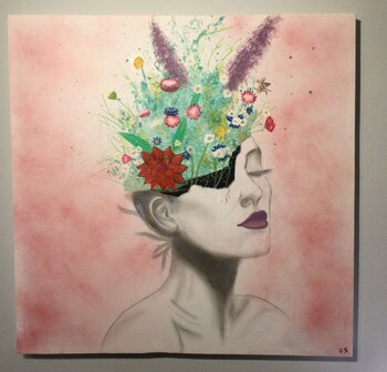 In this work, I mix oil, pencil, spray and ink techniques to create a surreal composition that explores the duality between nature and humanity. The protagonist carries in her head a lush garden of vivid flowers and fantastic elements, symbolizing thoughts and emotions that bloom from within. The soft palette contrasts with the intensity of the garden's colors, inviting the viewer to introspective reflection on the inner beauty and complexity of… our own emotional landscapes. This piece will add a touch of mystery and depth to any space, always evoking a dialogue between the visible and the hidden.