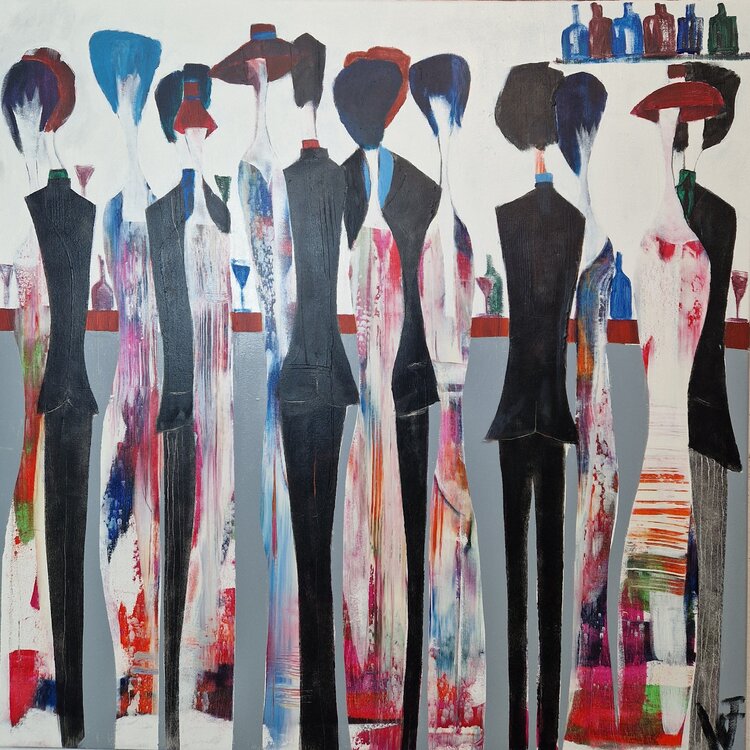 In my work I use acrylic paints to create a semi-abstract, figurative representation of stylized people in suits. This composition plays with the anonymity and uniformity of modern societies, with the facelessness of the figures suggesting a universal humanity. The vibrant, sometimes runny colors bring dynamism and emotionality into play, reflecting individual struggles and the beauty of the human spirit. This artwork is both powerful and inviting… and will add a deep, emotional presence to any room.