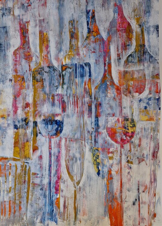 In my work I have worked with acrylic paints to create a semi-abstract image that captures the essence and spirit of wine. The flowing lines and warm tones reflect the excitement and passion that the process of drinking wine evokes. This painting brings an atmosphere of conviviality and enjoyment into your home and invites you to linger and celebrate. The picture is painted on 600g handmade paper.