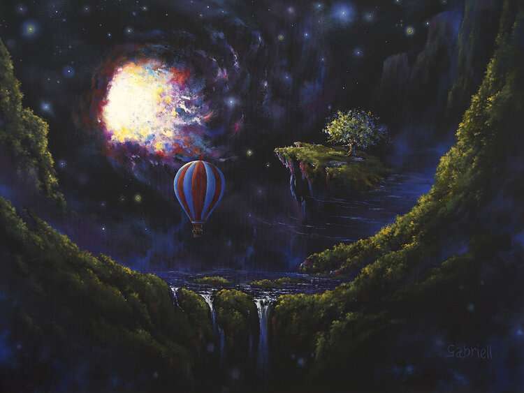 In this work, I explored the dreamlike boundaries where nature meets the cosmic infinite. A balloon travels through a surreal scene - mystical waterfalls beneath a glowing expansive universe, symbolizing a daring journey into the unknown. Using acrylic and oil, I captured a vibrant confrontation between dream and reality, inviting the viewer to question their own perspective of the universe. This art carries the energy of an eternal mystery, perfect… to enchant and transform any space with a touch of metaphysical wonderment.