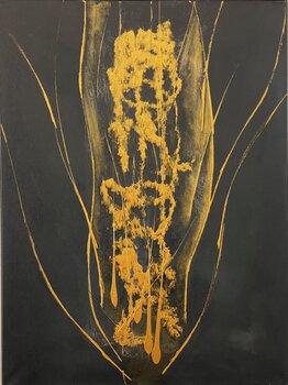 In this work I combine abstract expressionism with a vibrant energy highlighted by the dramatic contrast of deep black and brilliant gold. These colors represent the darkness and light within all of us. The dynamic interplay of colors conveys the emotional depth of a moment captured in time. This painting brings a powerful, energetic note to any room and invites you to reflect your inner strength and luminosity.