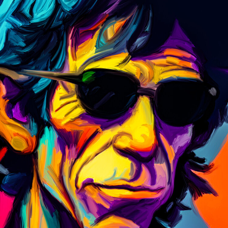 In this artwork I worked with acrylic paints, lithography and varnish on canvas to create a vibrant, expressive portrait. My goal was to capture the intensity and emotions of expressionism. Every brush stroke and color tone reflects a strong emotional world and gives every room energy and dynamism. This painting is a tribute to the power of expression and humanity.Keith Richards. He is a founding member of the British band The Rolling Stones, which… has existed since 1962, and has been a member of the band as rhythm and lead guitarist ever since. His riffs and licks are formative for the Rolling Stones' sound; he occasionally appears as the band's singer, as a soloist, as an electric bassist and in other formations. Richards co-writes with frontman Mick Jagger. The picture is half analogue and half digitally painted. It's unique!