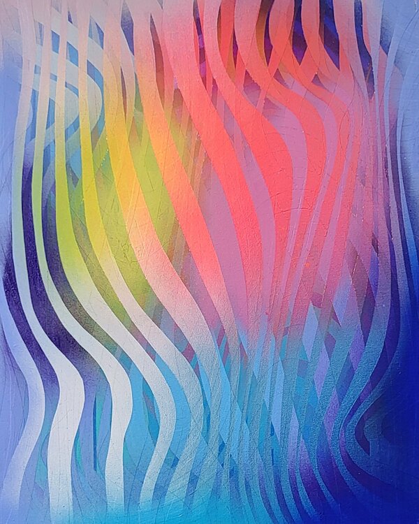 Soft gradients of violet, blue, and warm coral intertwine in rhythmic layers, creating a luminous optical field. The flowing lines evoke the shifting radiance of a halo — light bending, blending, and vibrating in motion.