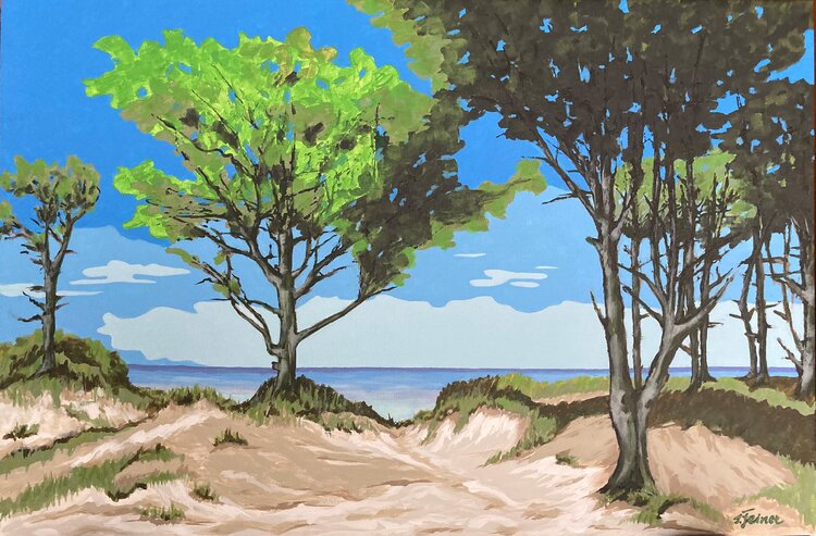 In this work I combine form and color in a semi-abstract representation. The acrylic colors bring dynamism and life to the scene, while the trees on the beach are a symbol of resilience and calm. It conveys the essence of a quiet day on the coast, a place of reflection and inner peace. In every home it will create an atmosphere of relaxation and inspiration.