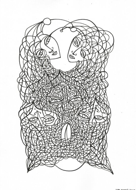 The form condenses from a network of lines into a body that remains not closed, but permeable. Eyes emerge fragmentarily from the structure, suggesting a consciousness that only takes root in the process of becoming. The drawing depicts embodiment not as a fixed… state, but as a continuous transition between mind, perception, and world.