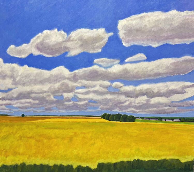 This is a painting of the Loire Valley in Springtime. The fields of mustard are in full bloom and are a spectacular yellow. A mix of sun and clouds completes the gorgeous view of the fields.