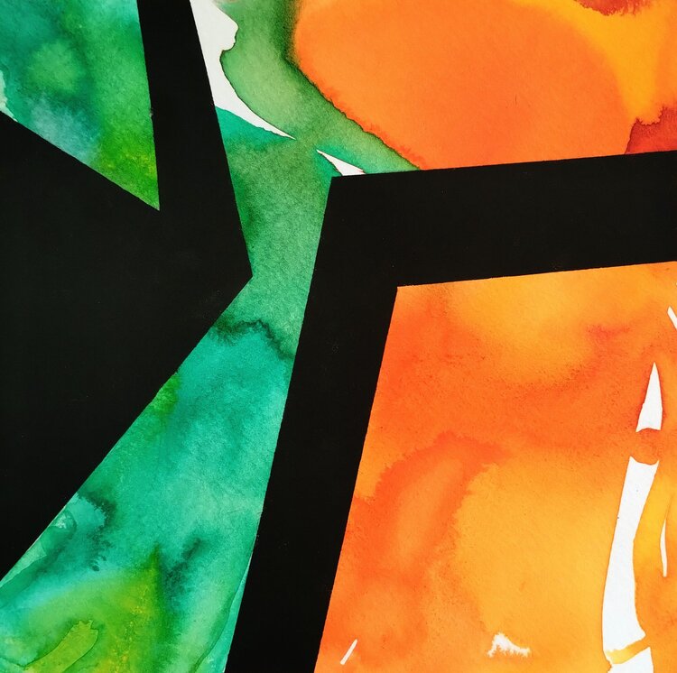 In this work of art I passionately combine the intensity of acrylics with the lightness of watercolors. The abstract composition reflects my emotions: bold black shapes meet the vibrant green of nature and the fiery orange of a setting sun. It invites viewers to find their own interpretations. This dynamic transforms any room and breathes energy and inspiration into it.