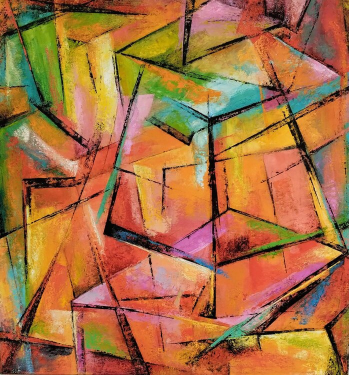In this oil painting I have captured passion and dynamism through the use of abstract, geometric shapes. The bold colors and sharp lines embody a feeling of movement and energy. This work reflects the complexity of life and invites you to explore the depth behind the superimposed structures. It brings a lively and stimulating flair to any home and encourages the viewer to lose themselves in the complexity.