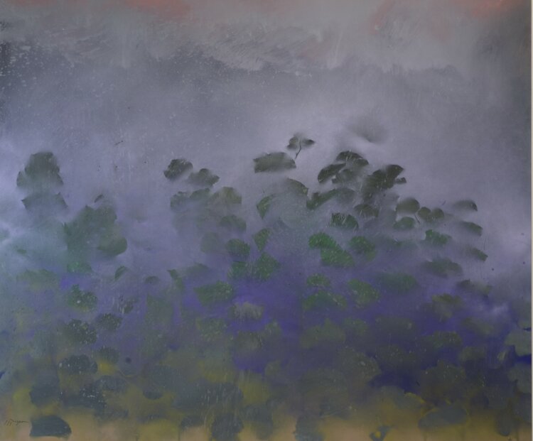 Alongside the series of works “Effeuillages”, this new painting with a purplish palette evokes an imaginary landscape. Between abstraction and figuration, we don't really know where to place ourselves, but whatever, there is an impression of serenity in this vagueness and this depth created by the nuances of tones and values. In a spirit close to ancient Chinese paintings, there is a sort of Far Eastern taste that emanates from this great painting.… The spectator is as if absorbed as long as he takes the time to contemplate...