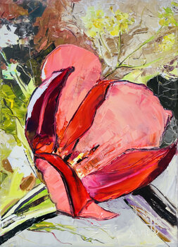 I created this work to capture the vibrant energy of a flower in full bloom. The colors are intense, and the semi-abstract forms blend expressionism and fauvism to convey that within the heart of the flower, all of existence flows, intense. Beneath the gentleness of spring, life bursts forth, vibrant.