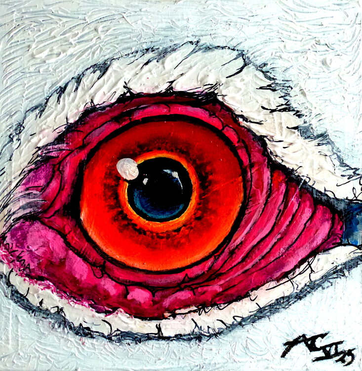 The work depicts a bird's eye. As an artist, I am fascinated by the diversity and color of animal eyes. For me, eyes are a special organ that creates a connection from the outside to the inside. Eyes can express a creature's current mood in many different ways. The eye in my painting stands in its own right as a work of art. The intense colors of the eye area and the white of the feathers create a strong contrast, which increases the tension when… viewing.