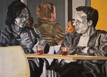 In this piece, I captured the feeling of distance amidst closeness — two people sharing space but separated by unseen walls. The muted tones reflect their inner solitude, while the glint of red in their drinks hints at fragile connection. I wanted to evoke the complex emotions of human interaction, where proximity doesn’t always mean understanding. This painting brings contemplative energy, inviting subtle reflection wherever it hangs.