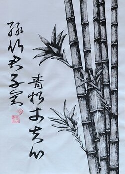 This work expresses bamboo, the meaning of the sentence on the left side is that the green bamboo is the mind of a gentle and honorable person and the green pine is the mind of the great master.