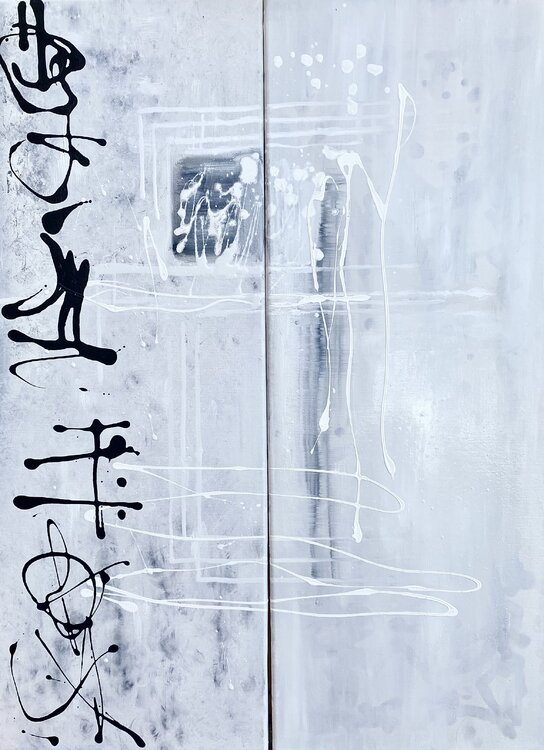 The most important aspect for me was to make the painting energetic and meditative at the same time. I know that sounds contradictory, doesn't… it? I used the decalcomania technique and many oil and acrylic paint mediums, which were more challenging than anticipated. It is oil and acrylic work, and many weird mediums together. I am a real Japanophile, so I had to incorporate some Japanese accent, and as you can see, I succeeded. Arigato.