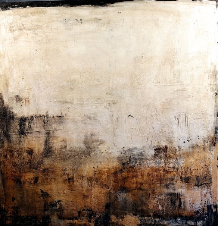 Im Moor captures the quiet yet powerful atmosphere of a landscape that oscillates between earth, fog, and shadow. With subdued colors in warm brown and beige tones, as well as dark accents, a multi-layered image emerges that conveys moods rather than concrete forms. The rough texture and open spaces leave room for associations—between depth, transience, and the mysterious beauty of the indeterminate.