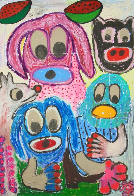 In my artistic practice, I work predominantly figuratively and intuitively. My work is characterized by a dense, often deliberately overloaded visual language in which color, line, and form exist in an expressive tension with one another. Figures, signs, and surfaces overlap, creating open, emotionally charged pictorial spaces. From an art historical perspective, my work can be situated within the context of Art Brut, Naïve Art, and Neo-Expressionist figuration. My series of works do not develop linearly, but rather in parallel, reflecting different states, questions, and formal approaches. While series such as Rebels and Creatures are characterized by visual density, intense color, and gestural energy, more reduced series like Ghosts or the newly created Black Heads represent concentration and presence. With the series Abstraction it is, my work opens itself towards Expressionist abstraction while maintaining a consistent emotional connection to figuration.