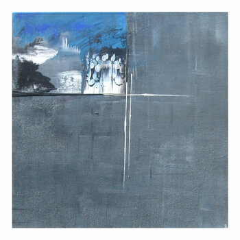Dealing with ZEN meditation and the art of simple living. Reduced application of paint on a quarter of the picture surface. The grey part of the surface represents the part of our life that takes place in our inner worlds and has the greater share in our existence. The dark tones flow together and abruptly interrupt the clear, almost metaphysical blue surface, which symbolizes a vision of boundaries and transitions. This painting is an invitation… to reflect on the unknown expanses of our soul and the silence that resides in simplicity. It brings a calm, thoughtful energy to any room.