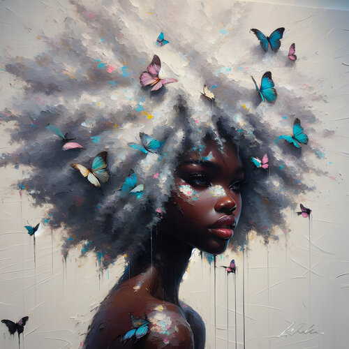 "Light Spirit" is a digital artwork printed on canvas, vibrant with poetry and grace. This Afro-feminine portrait, enhanced by flowing hair dotted with colorful butterflies, symbolizes freedom, nature, and lightness of soul. Pastel shades, luminous blues, and touches of pink delicately contrast with the depth of the complexion, creating a captivating visual balance. The soft and serene expression of the face invites inner calm and contemplation.…