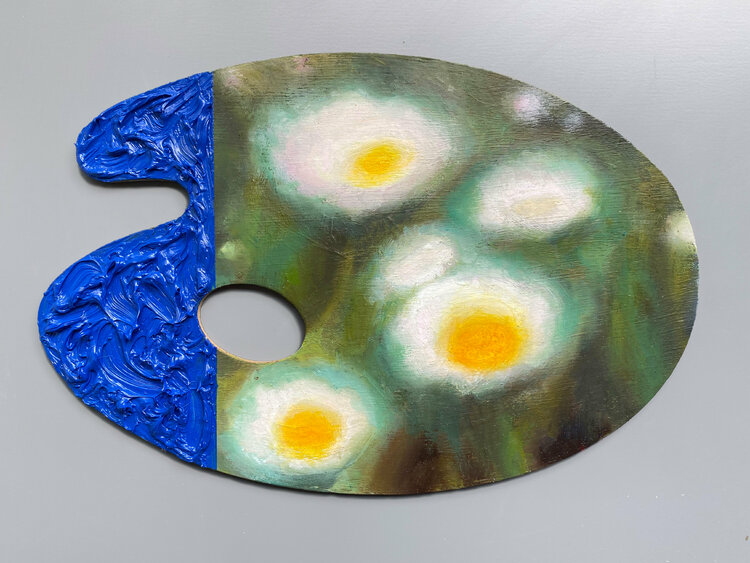 In this oil painting, I've rendered a whimsical depiction on a palette itself, blending the tool of creation into the artwork. The vivid, swirling blues against the muted background symbolize the intense creative spirit and emotional depth of the artistic process. The palette embodies the birthplace of art, where colors dance and merge to bring emotions and visions to life. This piece visually speaks about the joy and complexity of creation, perfect… for inspiring any space with creativity and reflection.
