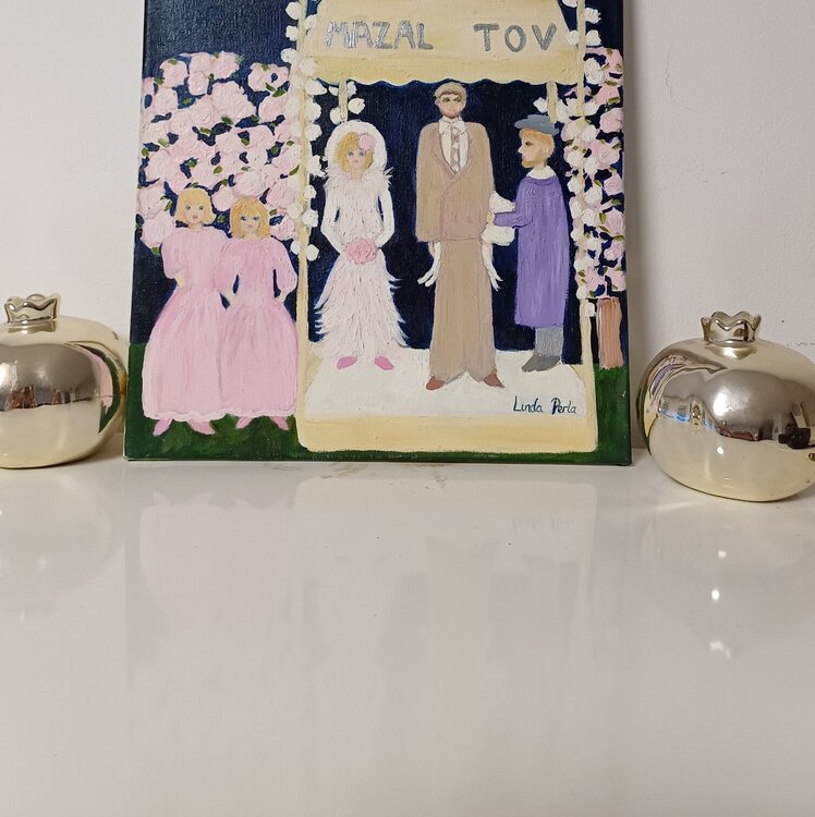 In this naive oil painting, I wanted to capture the sweetness and joy of a unique moment, a wedding filled with hope and love. The pastel colors convey tenderness, while the simplicity of the forms invites pure and sincere emotion. This painting will bring a warm and promising energy to your home.