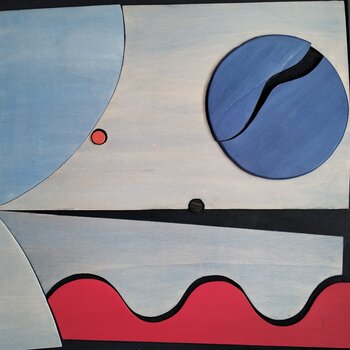 A wooden sculpture-painting in shades of blue, yellow, and red, divided into two elements yet unique as a whole. Inspired by Pink Floyd's experimental, spirealist music from the album "The Piper at the Gates of Down," their first studio album with Syd Barrett. An idea of what an unknown world might be like? Yes, a world organized in its apparent order, yet alive and in constant motion toward distant stars that are also in motion. A composition that… expresses musicality, relaxing for me, but also mysterious, like all the things we can't normally see, but know exist and surround us. "Nature is great in small and large things, and it's up to us to respect it." This work is an original, produced in a limited edition of seven, each with its own certificate of authenticity.