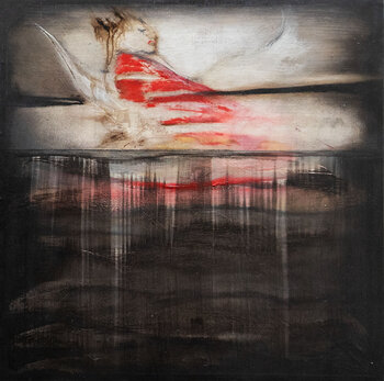 A fantastic figure, asleep on a boat, lets himself be carried away by the flow of the waters. A vision. The painting, in oil and wax on canvas, is ready to hang and will be shipped with due care.