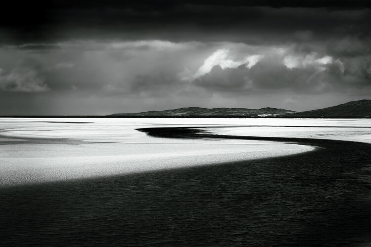 In Spring at Luskentyre Bay, the vast sands of the Isle of Harris are transformed into a study of light and movement. Rendered in black and white, the composition captures the graceful curve of the outgoing tide as it sweeps across the silver shore toward the dark, still waters beyond. Taransay lies in the distance, a quiet sentinel beneath shifting skies.