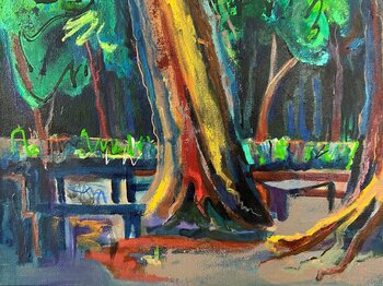 A solitary park worker pauses for a quiet rest, surrounded by towering, centuries-old trees. The painting evokes a silent connection between human effort and nature’s enduring presence, inviting reflection on our place within the natural world.