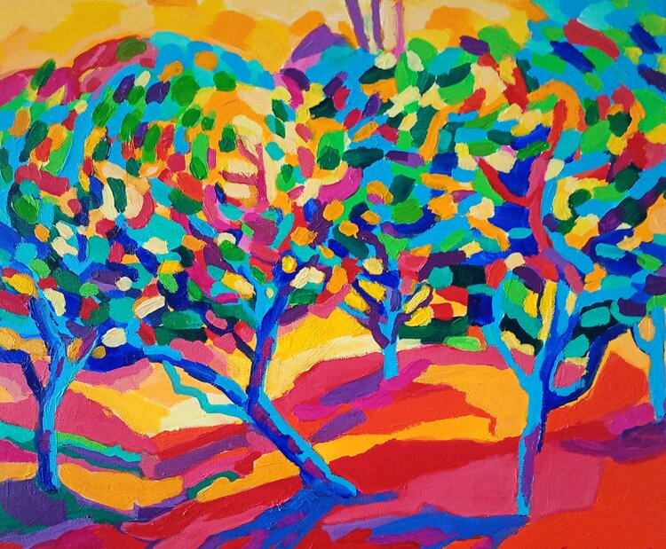 This is one of my many expressions of orchard trees, from the series of colourful orchards, in bold, contrasted colours.