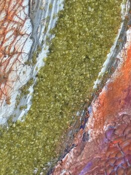 Gilded Bloom combines mineral textures with a dynamic, organic movement. From a powerful center, a flower-like form unfolds, supported by layers of gold, ochre, violet, and vibrant green.