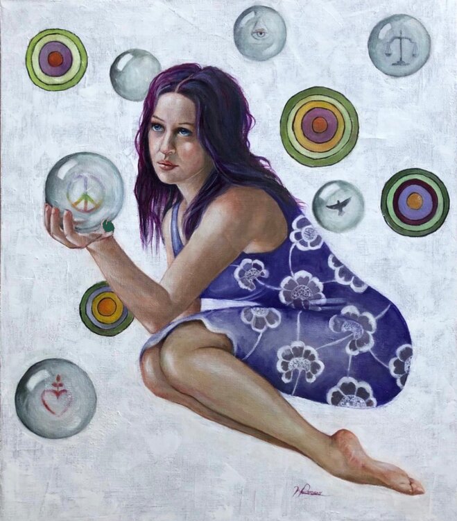 Oil allowed me to blend intense tones with delicate nuances, creating a visual dialogue that invites the observer to reflect on their perception of reality. The central figure, wrapped in a fabric with floral motifs, represents the personal search for harmony; it supports a sphere that symbolizes Peace. The shapes that float around,… symbolically represent the foundations of Peace, namely: Freedom, Love, Truth and Justice.