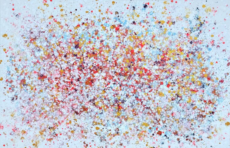 I work primarily with acrylics on canvas, sometimes incorporating basalt stone or other natural materials. Metallic tones such as copper, gold, or silver, as well as vibrant neon colors, bring a lively tension to the work and change their effect depending on the light and viewing angle.