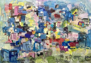 Marie Manon Corbeil began to paint amidst personal challenges:‘Between sadness and hope, there was art’. Realizing that life’s difficulties provided her with a new means of expression, Corbeil wants to convey a sense of joy within her contemporary abstract works. She draws forms and writes positive words under each canvas before beginning a piece. Employing large brushes to provoke unplanned strokes, she also uses her fingers to optimize the vibrant colors in her compositions.
