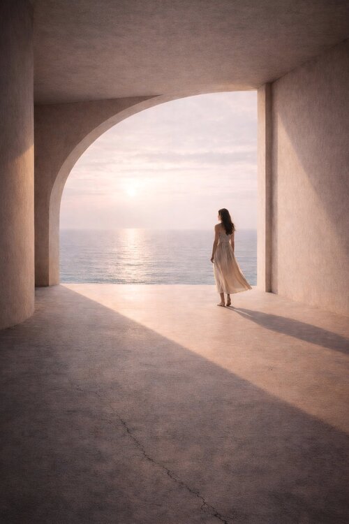 A solitary figure stands at the threshold between interior and horizon, where soft light dissolves the boundary between space and sea. The architecture frames a moment of quiet transition, inviting a sense of stillness and reflection.