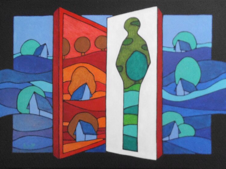 This painting fits into the theme of seasonal disturbances. The central silhouette, symbolizing summer, looks at autumn whose trees still bear their red and yellow leaves against a background of blue landscape reminding that winter despite this disruption is fast approaching.