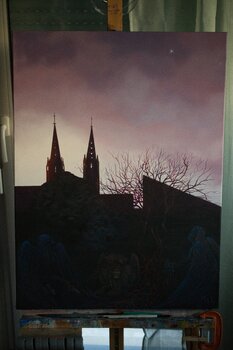 With this artwork, I wanted to capture a silence imbued with mystery, where the silhouette of the bell towers rises like a bridge between the real and the invisible. The dark forms and delicate branches create a balance between the tangible and the spiritual, inviting deep meditation. It will bring an enigmatic atmosphere to your home, imbued with an energy that is both calm and powerful.