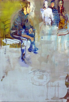 In this painting, I have captured emotional melancholy and quiet anticipation. The blurred figures and powerful brushstrokes reflect the struggle between presence and transience. The atmosphere is characterized by inner tension, which fills the space with a mysterious energy. It invites you to immerse yourself in these moments and feel the invisible connection that exists between people.