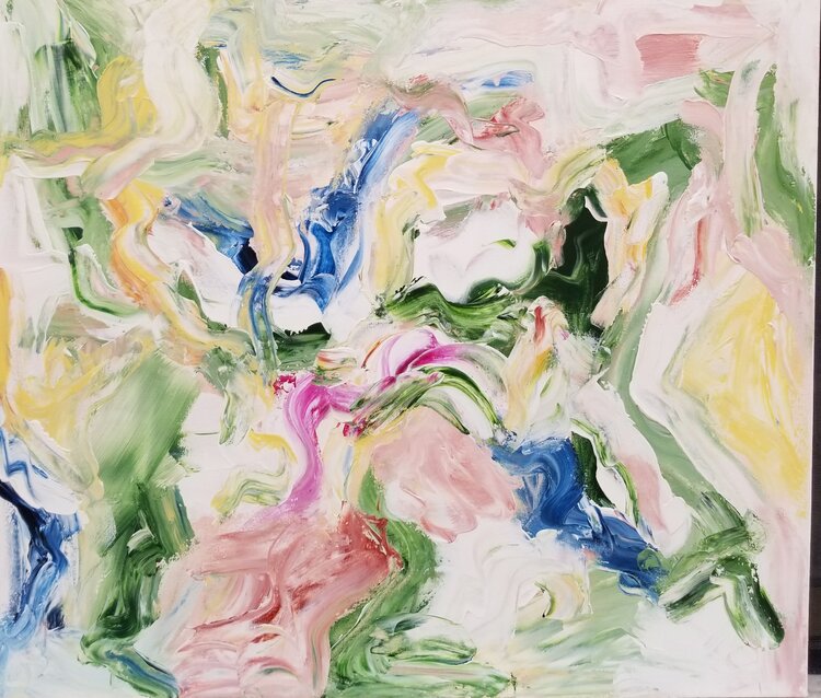 Unruly Grace captures the fierce elegance of transformation—a raw, sweeping gesture held in delicate balance. The composition pulses with wild energy: tangled brushstrokes, fragmented blooms, and flashes of flesh-toned warmth all collide in a storm of motion. Influences of de Kooning aggression, and Cecily Brown’s fleshy chaos, the work resists stillness. Grace here isn’t soft—it’s defiant, muscular, and messy. Where beauty isn’t quiet—it thrashes,… pulses, and blooms on its own terms. . It’s about struggle: the act of painting, the body in space, and the friction between instinct and intention. Nothing polite. Nothing still.
