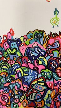The artwork titled “Free Fall” is the fifth piece in a series that explores the concept of falling through abstract representation. It depicts a scene where numerous characters, outlined by irregular shapes and a very varied palette of colors, seem to be in full downward movement. The colors used are bright and contrasting, with a predominance of primary hues mixed with more vibrant and neon shades. These figures are arranged to create a dense top… and bottom border, giving the illusion that the central white area is attracting or expelling the figures. The shapes suggest a certain fluidity and lightness, as if they were suspended in a moment of free fall, captured in full dynamic.
