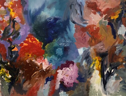 She creates without a fixed direction, letting the canvas guide her, revealing an unexpected balance or controlled chaos. This intuitive, almost meditative approach gives rise to works without turbulence, but charged with emotion, silence, and hidden meaning.